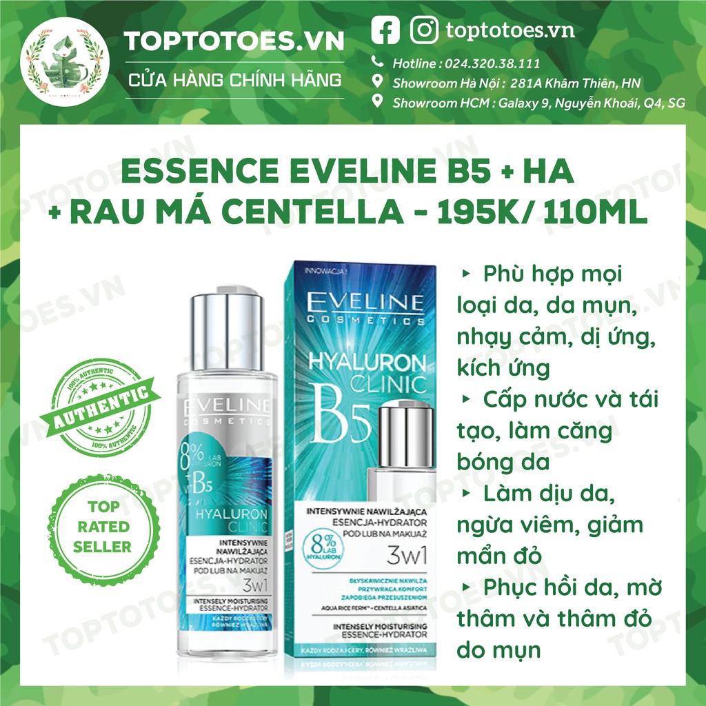 Freeship- Essence Eveline Hyaluron Clinic B5 & tinh chất rau má Centella làm dịu, dưỡng ẩm, phục hồi da mua tại đây